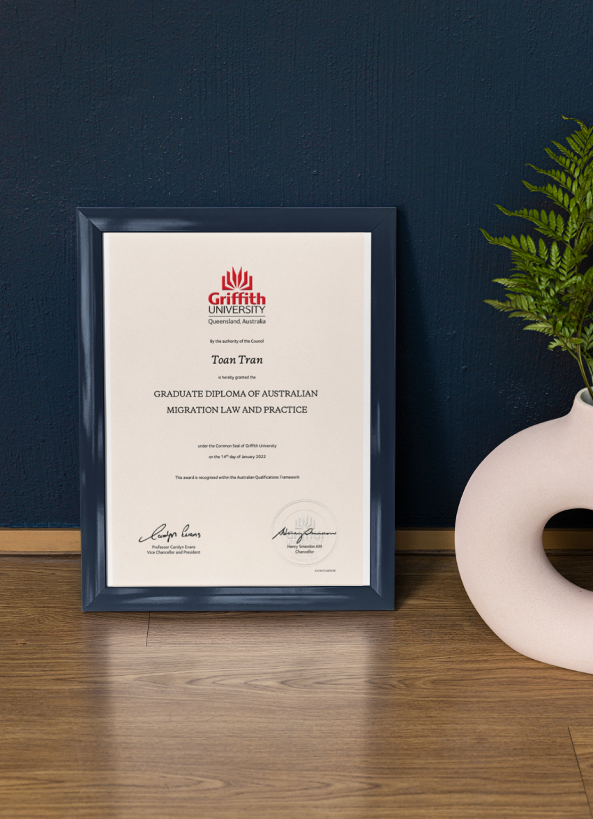 Toan Tran has the following Australian migration law qualifications including the Graduate Diploma of Australian Migration Law and Practice from Griffith University.